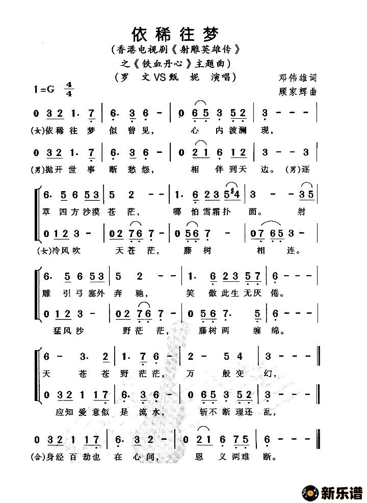 罗文、甄妮演唱的依稀往梦(电视剧《射雕英雄传》之铁血丹心主题曲)歌词,依稀往梦(电视剧《射雕英雄传》之铁血丹心主题曲)最新曲谱.