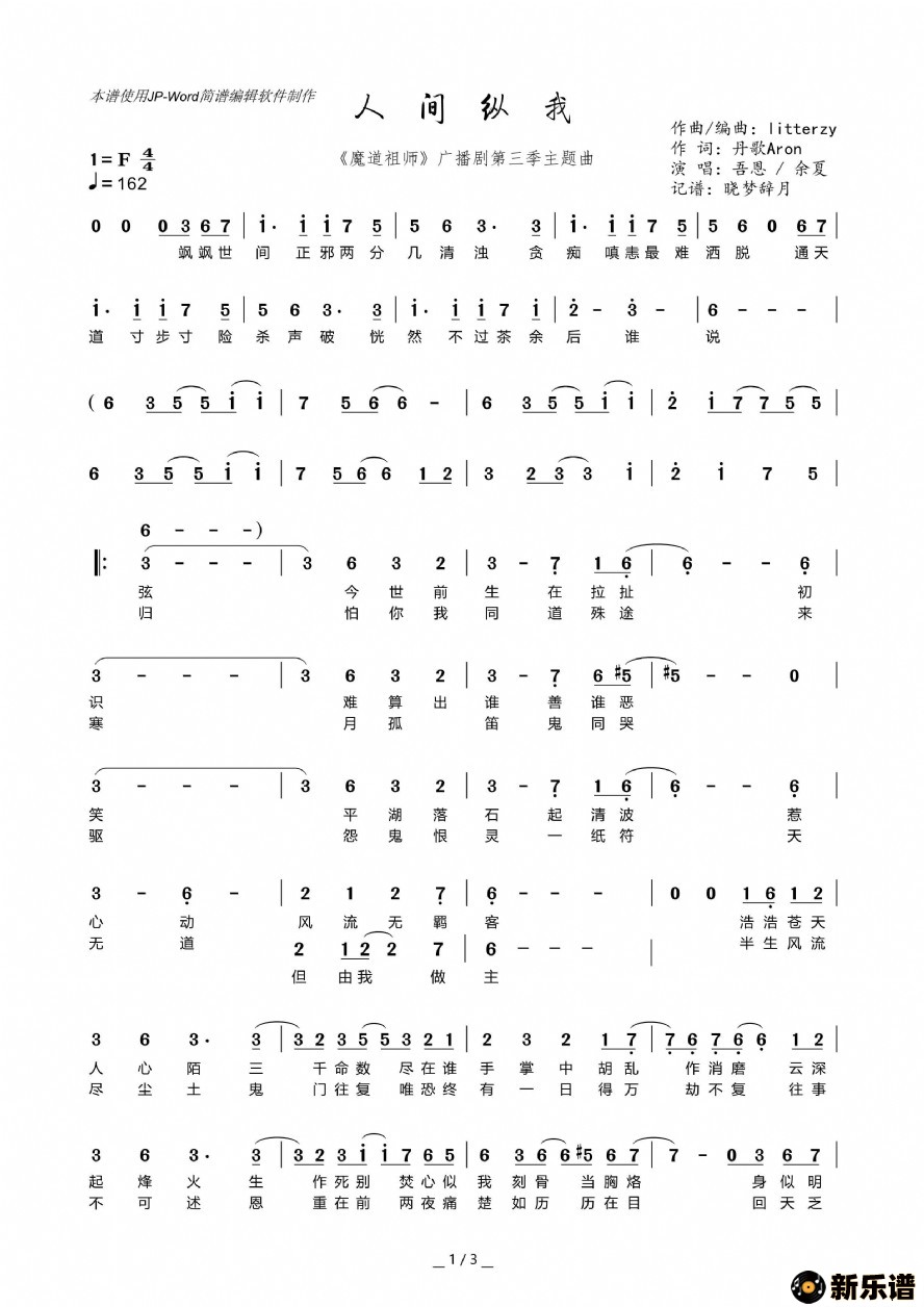 > 人间纵我(《魔道祖师》广播剧第三季主题曲)最新曲谱