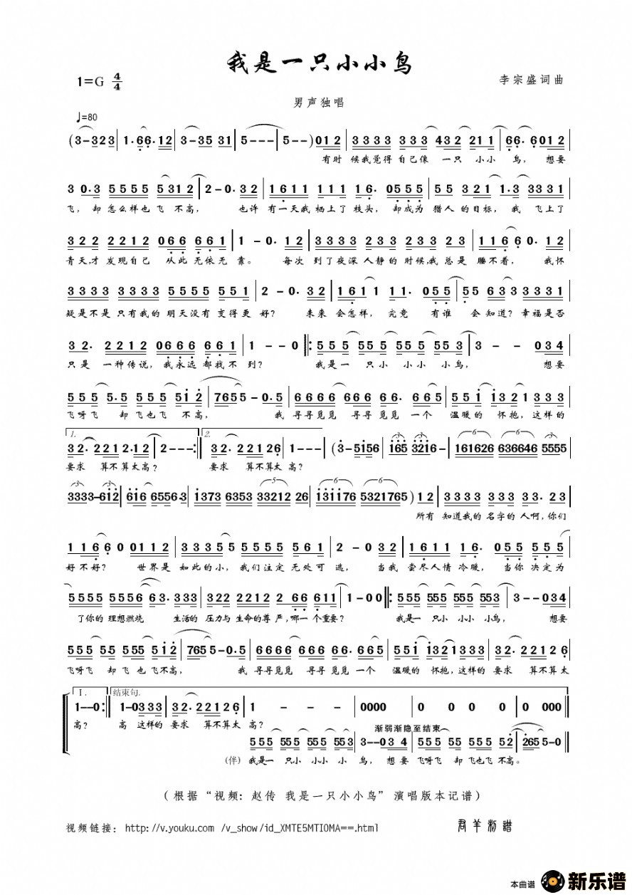 赵传演唱的我是一只小小鸟歌词,我是一只小小鸟最新曲谱.