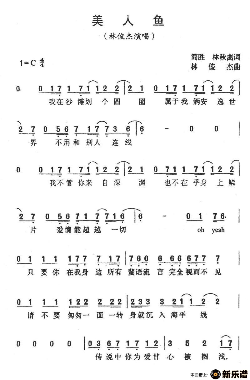 林俊杰演唱的美人鱼歌词,美人鱼最新曲谱.