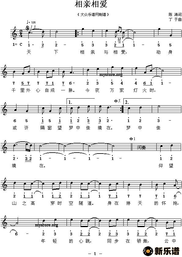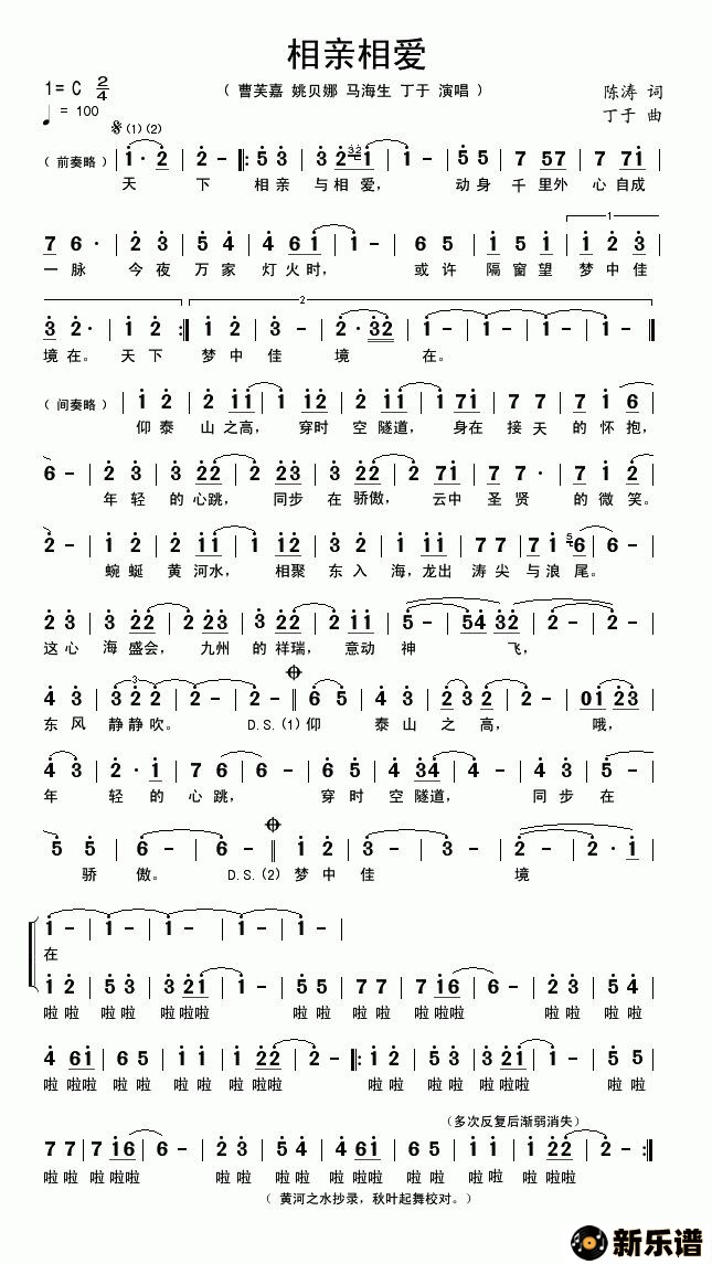 相亲相爱曹芙嘉、姚贝娜、马海生、丁于 曹芙嘉、姚贝娜、马海生、丁于演唱的相亲相爱歌词,相亲相爱最新曲谱. 本站抄谱上传:唱响中国官方网站提供的简谱:《大众乐谱网》制作的线、简谱混排版曲谱:《通俗歌曲》刊发