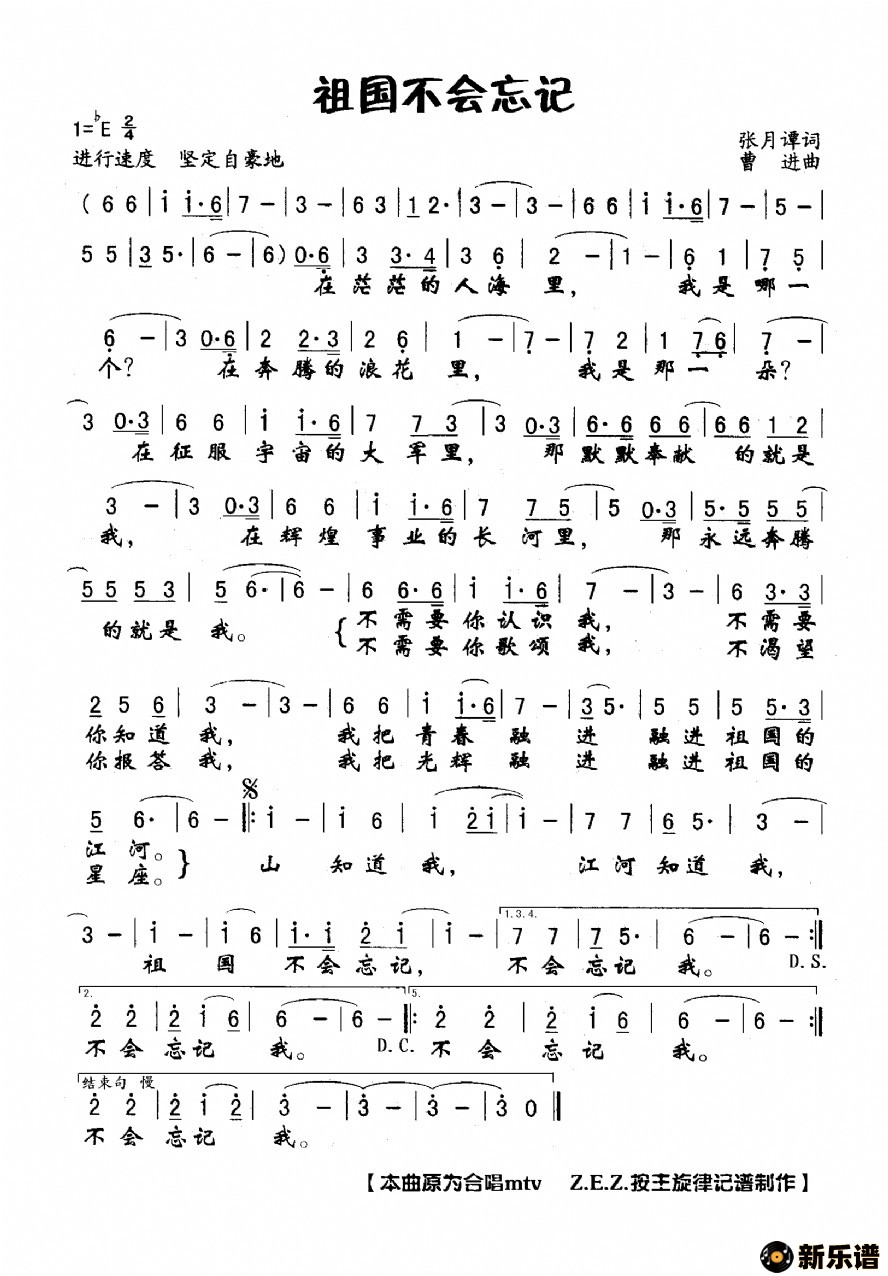 > 祖国不会忘记最新曲谱
