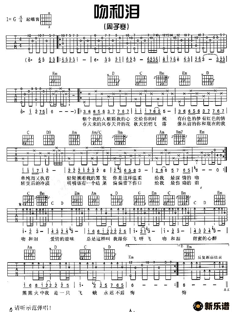 周子寒演唱的吻和泪歌词,吻和泪最新曲谱.