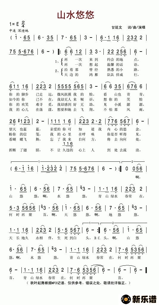 甘延文演唱的山水悠悠歌词,山水悠悠最新曲谱.