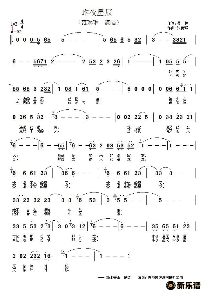 范琳琳演唱的昨夜星辰歌词,昨夜星辰最新曲谱.