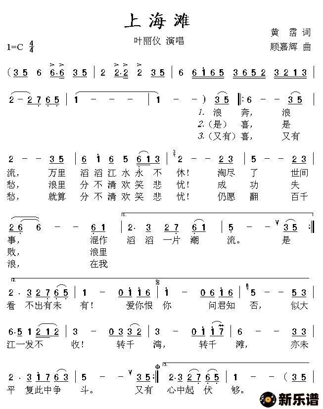 《上海滩(同名电视剧主题歌、粤语演唱)》最新曲谱 叶丽仪