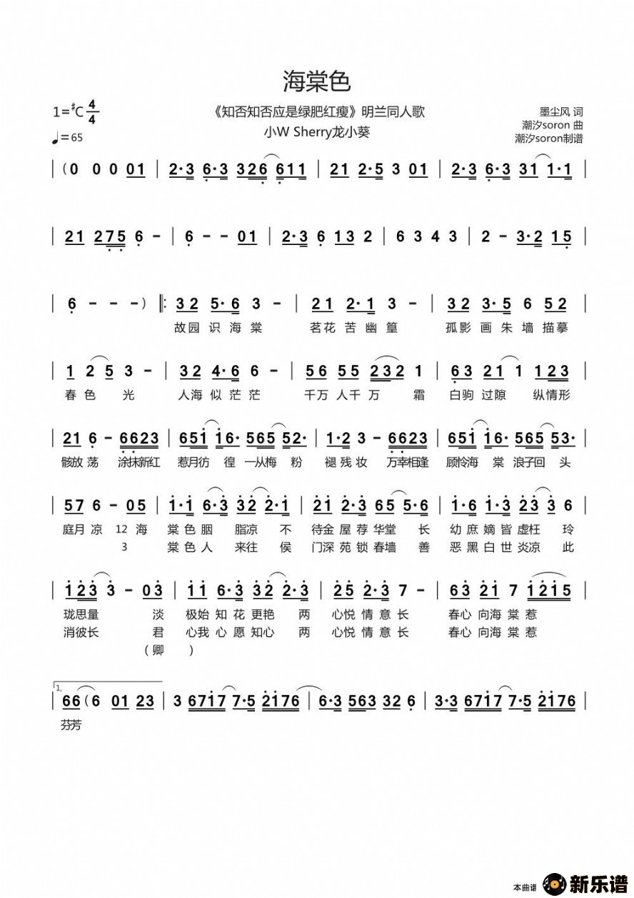 《海棠色》最新曲谱 小W & Sherry龙小葵