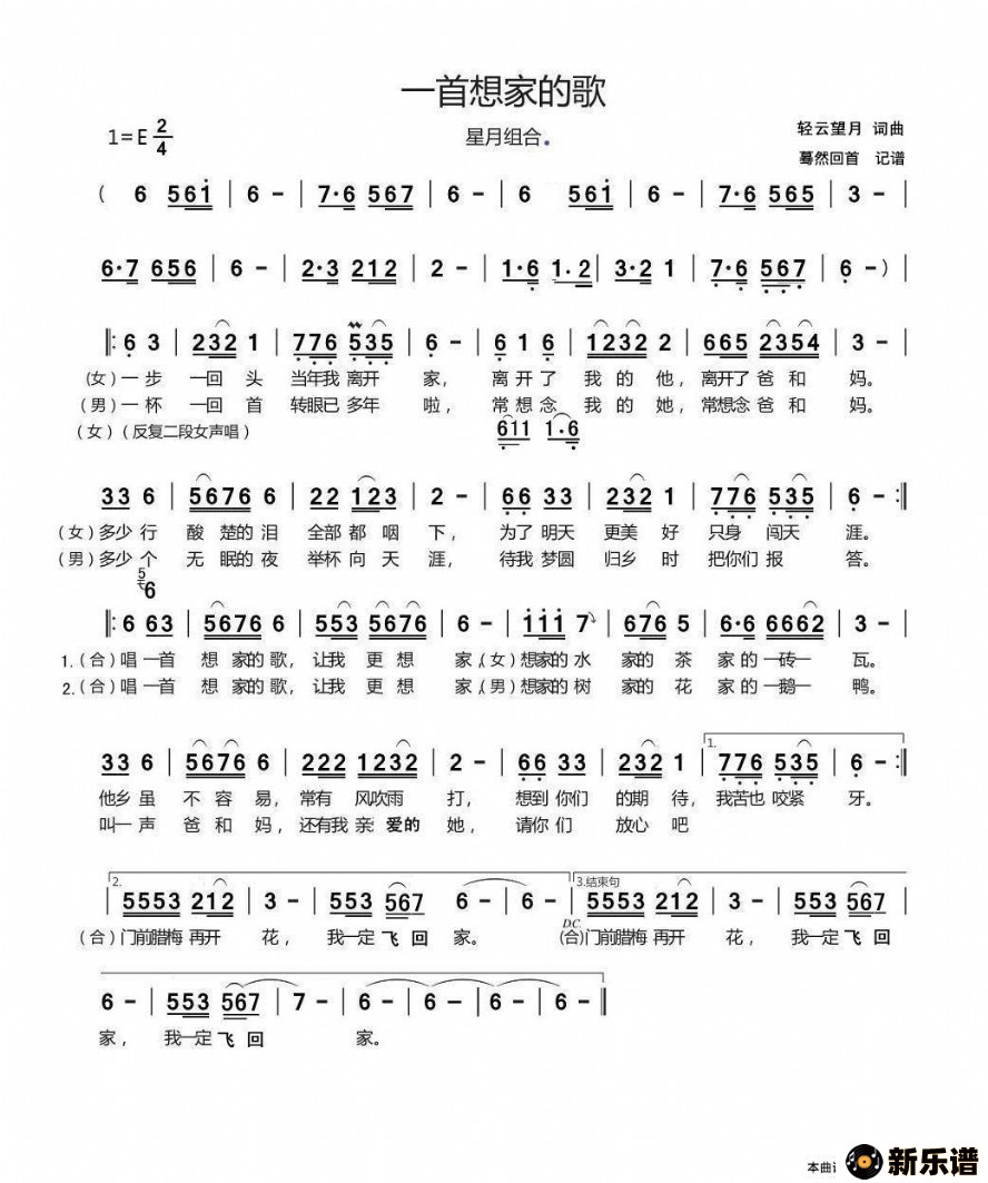 《一首想家的歌》最新曲谱 星月组合-蓦然回首制谱