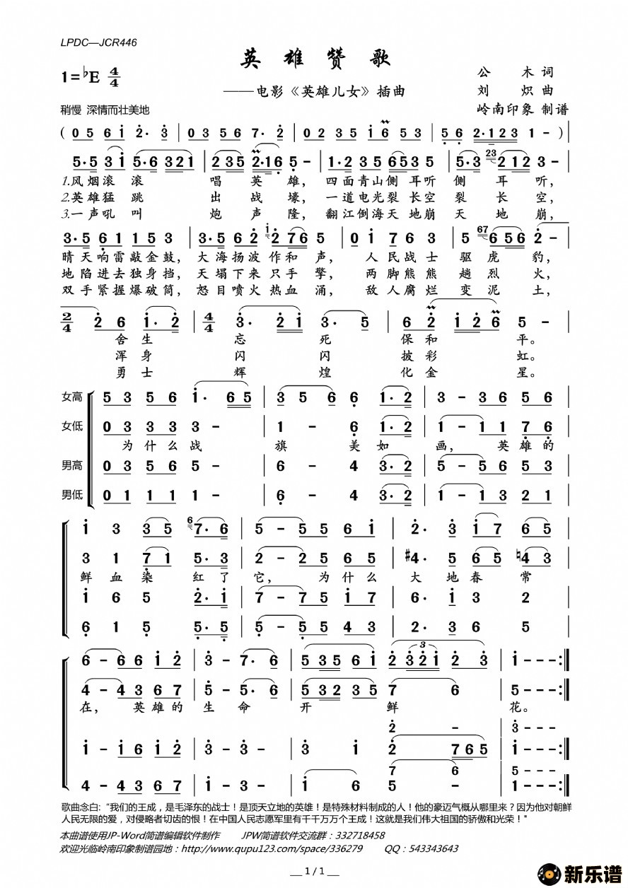 《英雄赞歌(电影《英雄儿女》插曲)》最新曲谱 张映哲-岭南印象制谱