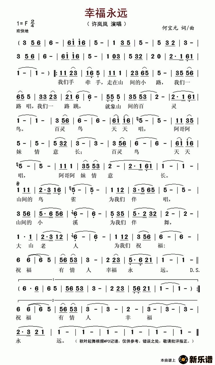 许岚岚演唱的幸福永远歌词,幸福永远最新曲谱.