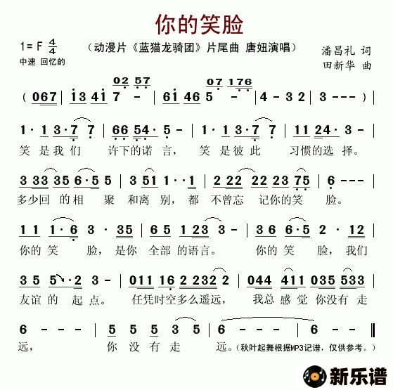 唐妞演唱的你的笑脸歌词,你的笑脸最新曲谱.