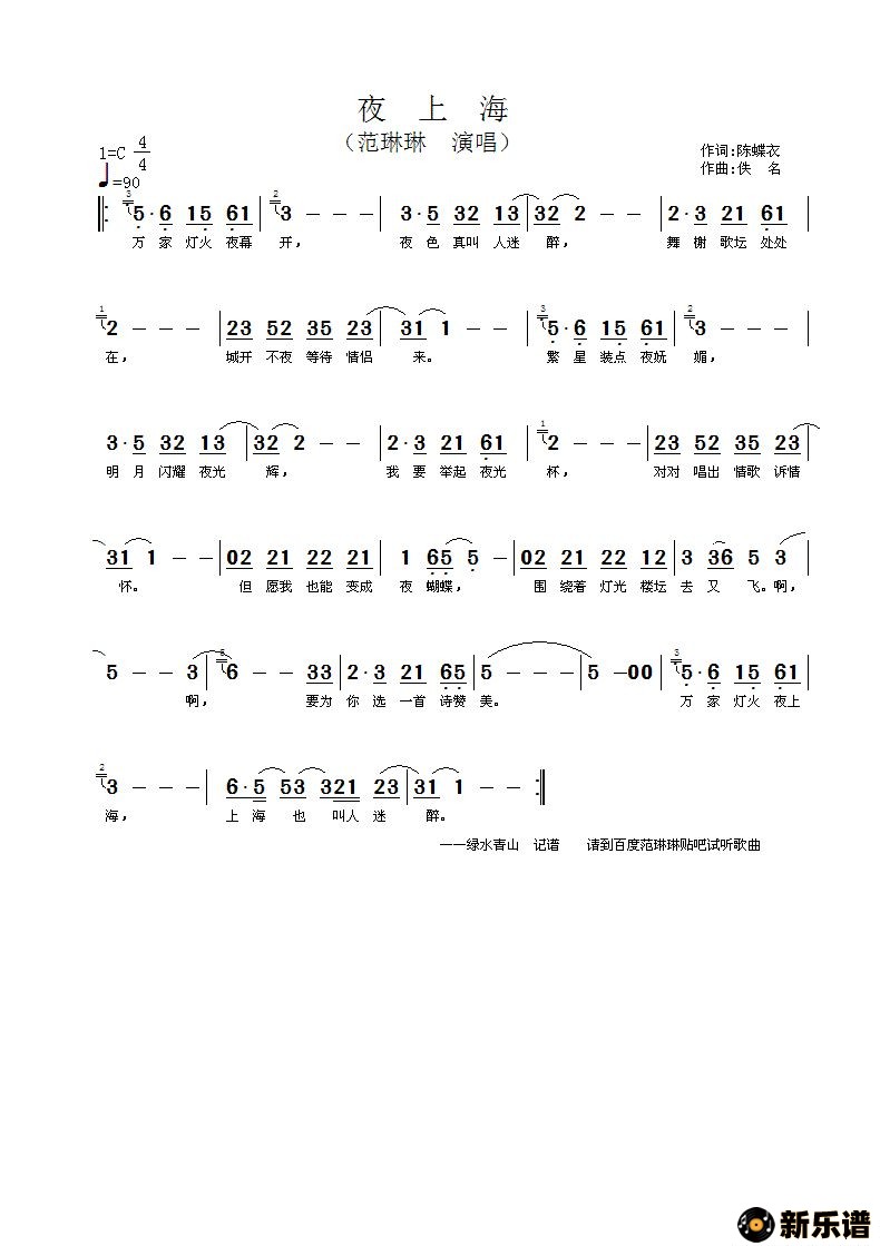 范琳琳演唱的夜上海歌词,夜上海最新曲谱.