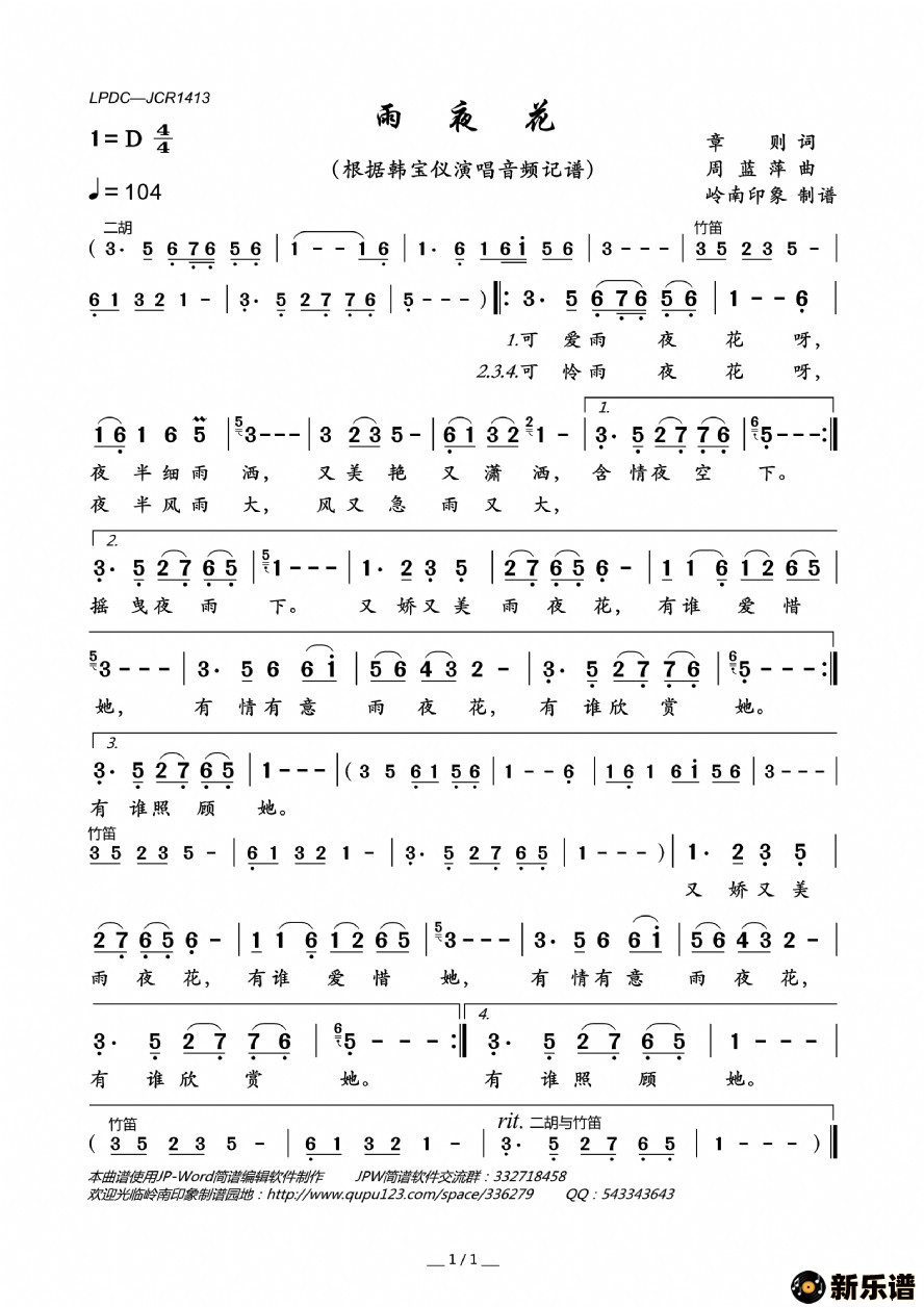 《雨夜花》最新曲谱 韩宝仪-岭南印象制谱
