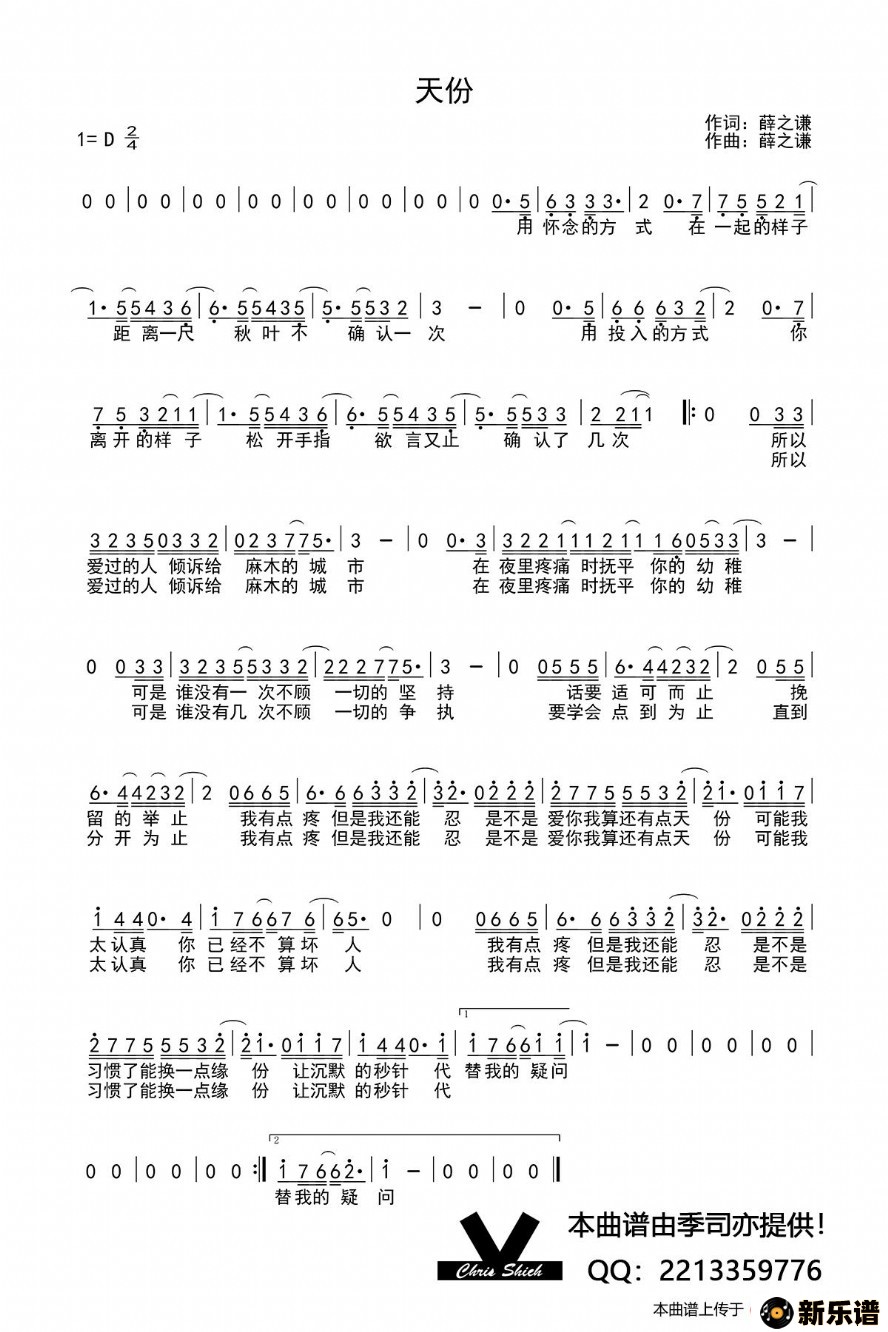 薛之谦演唱的天份歌词,天份最新曲谱.