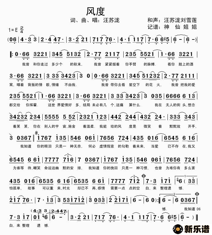 汪苏泷演唱的风度歌词,风度最新曲谱.