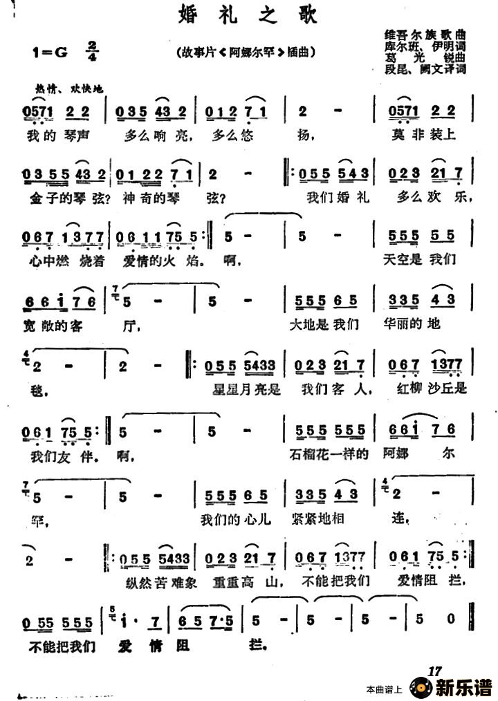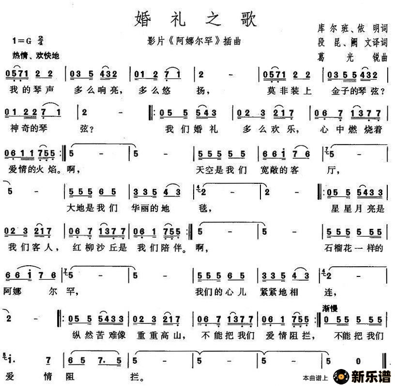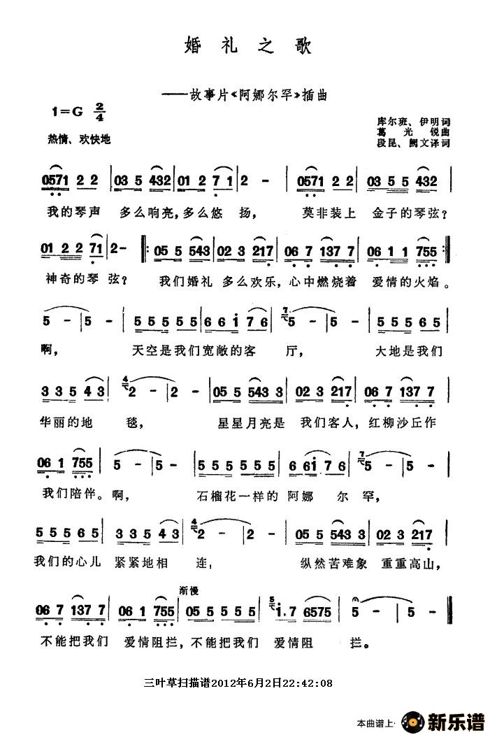 婚礼之歌(电影《阿娜尔罕》插曲)帕蒂曼 帕蒂曼演唱的婚礼之歌(电影《阿娜尔罕》插曲)歌词,婚礼之歌(电影《阿娜尔罕》插曲)最新曲谱. 本站上传谱友三叶草扫描上传:版本三:选自田联韬编著《中国少数民族爱情歌曲集》此最新曲谱由新乐谱会员 秋叶起舞 上传