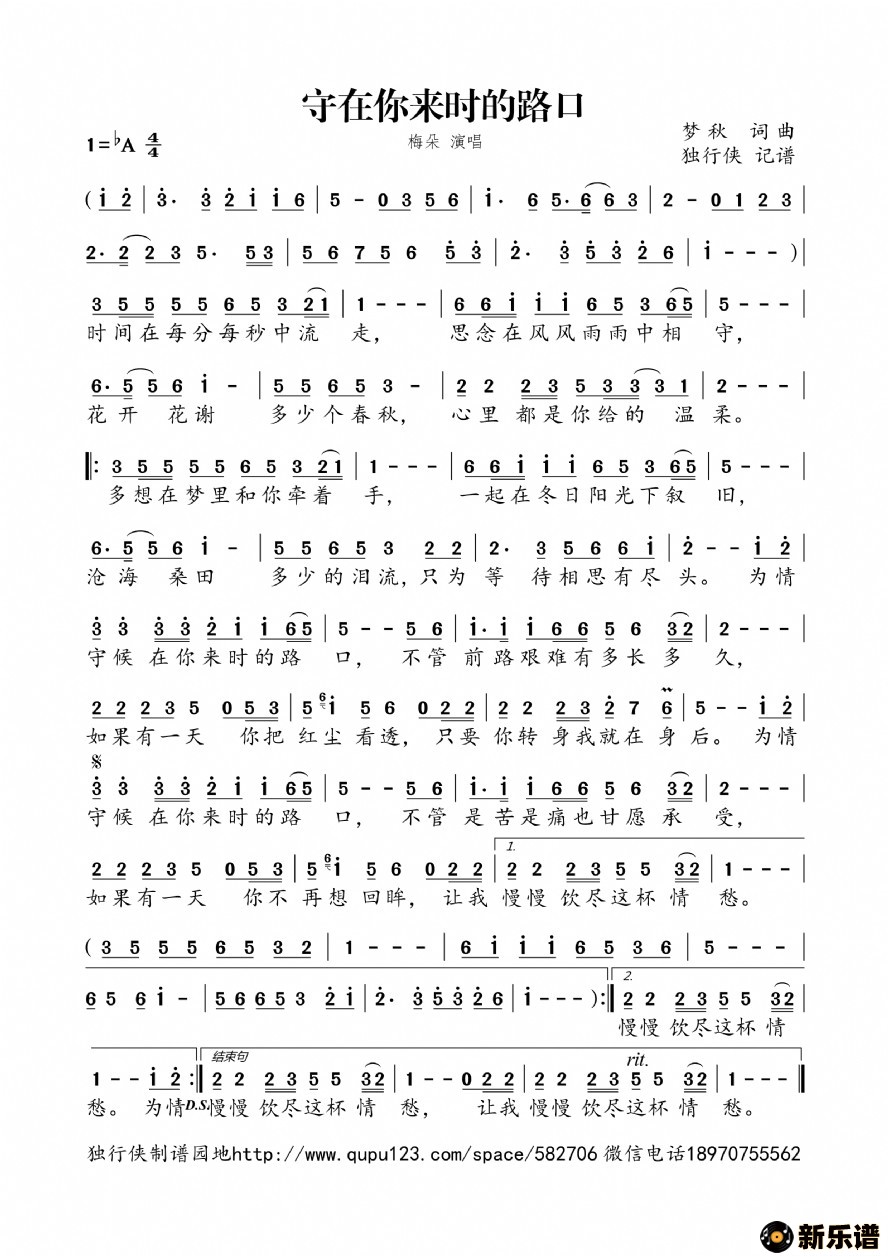《守在你来时的路口》最新曲谱 梅朵-独行侠制谱