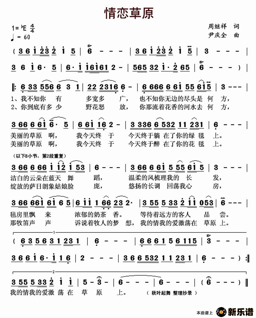 忢訫演唱的情恋草原歌词,情恋草原最新曲谱.