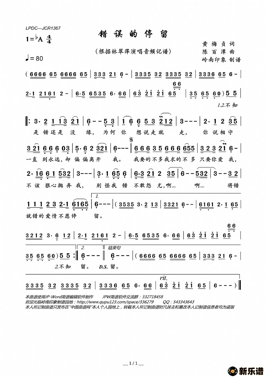 《错误的停留》最新曲谱 林翠萍-岭南印象制谱