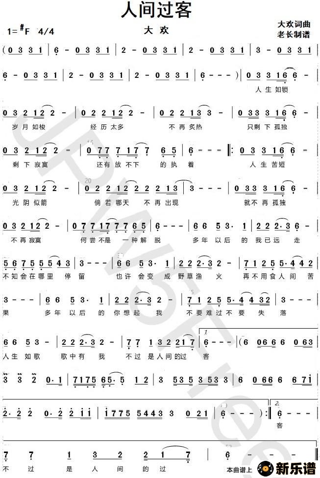 《人间过客》最新曲谱 大欢