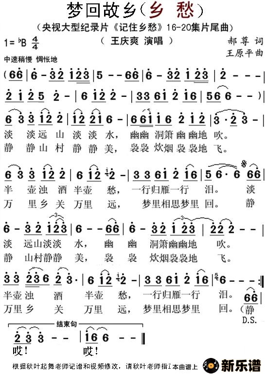 王庆爽演唱的梦回故乡歌词,梦回故乡最新曲谱.