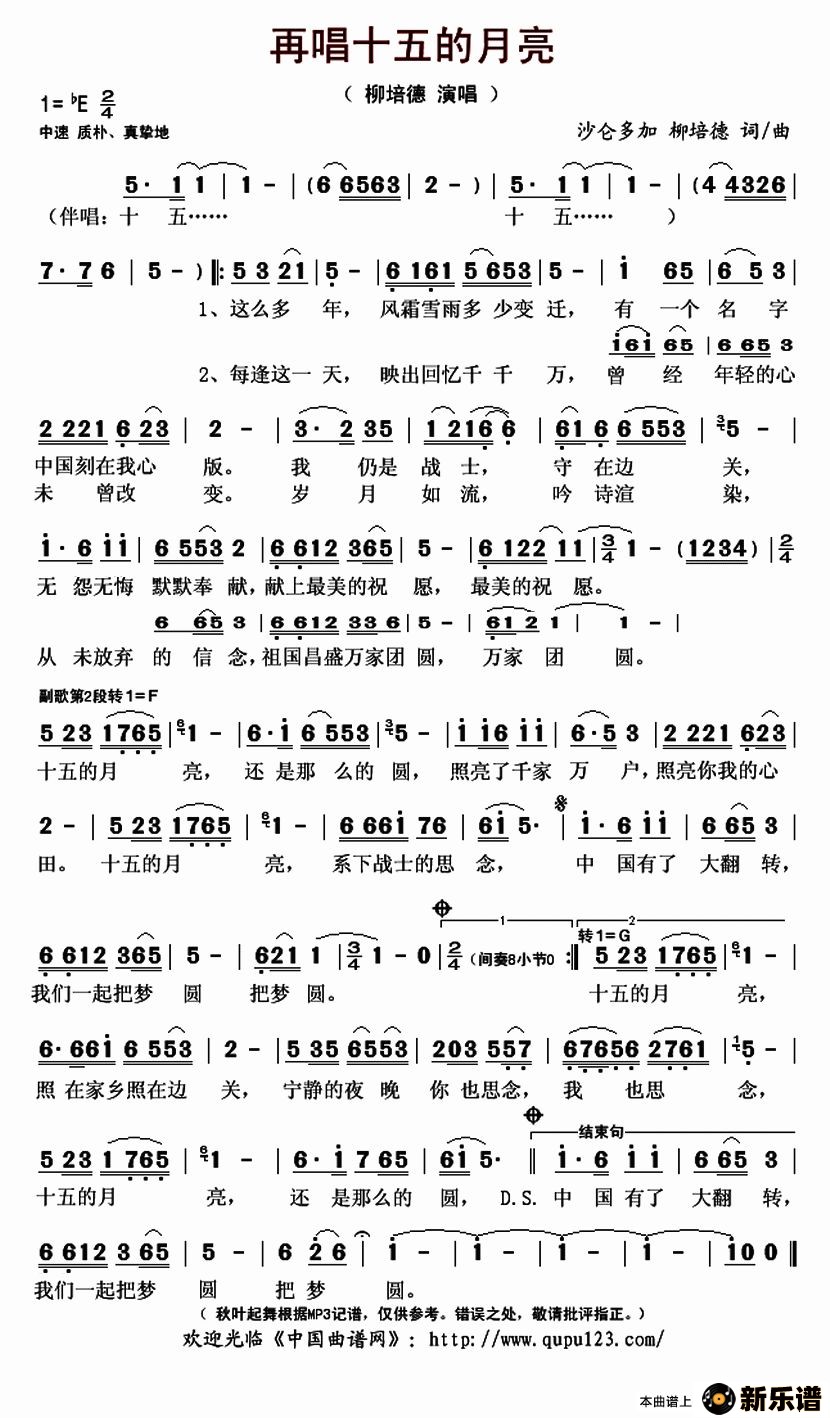柳培德演唱的再唱十五的月亮歌词,再唱十五的月亮最新曲谱.