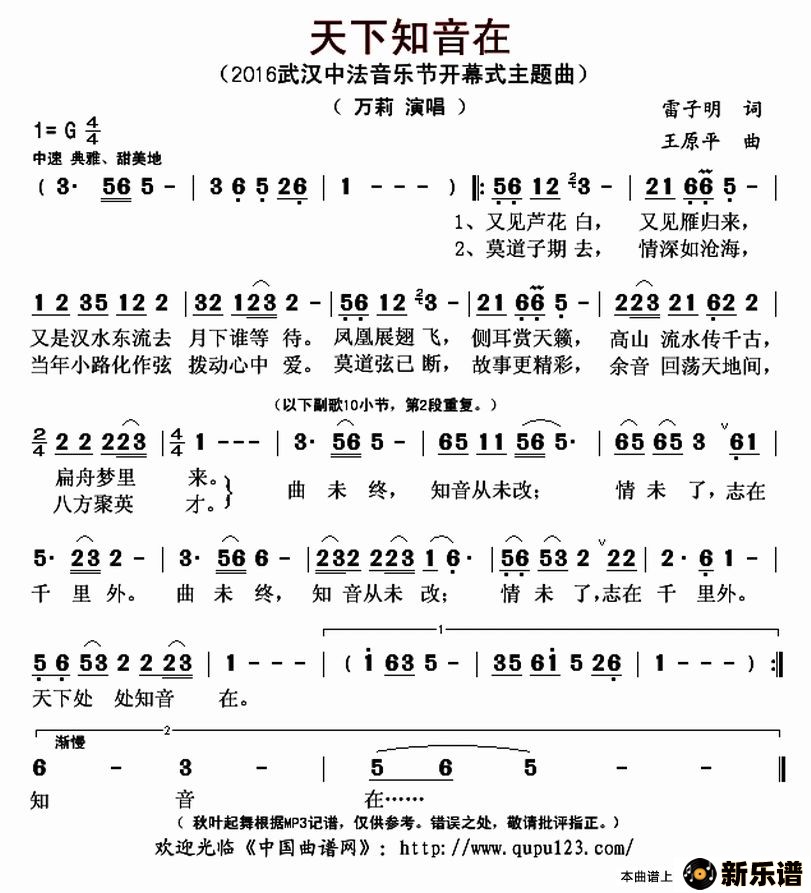 万莉演唱的天下知音在歌词,天下知音在最新曲谱.