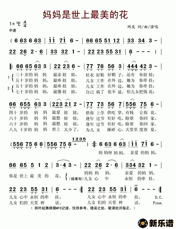演唱的妈妈是世上最美的花歌词,妈妈是世上最美的花最新曲谱.