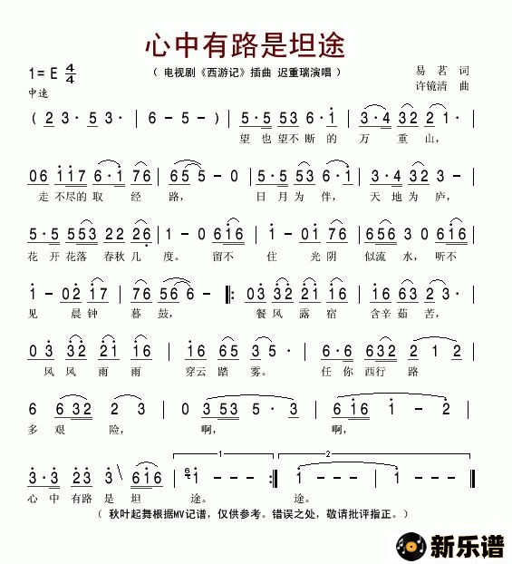 迟重瑞演唱的心中有路是坦途(电视剧《西游记》插曲)歌词,心中有路是坦途(电视剧《西游记》插曲)最新曲谱.