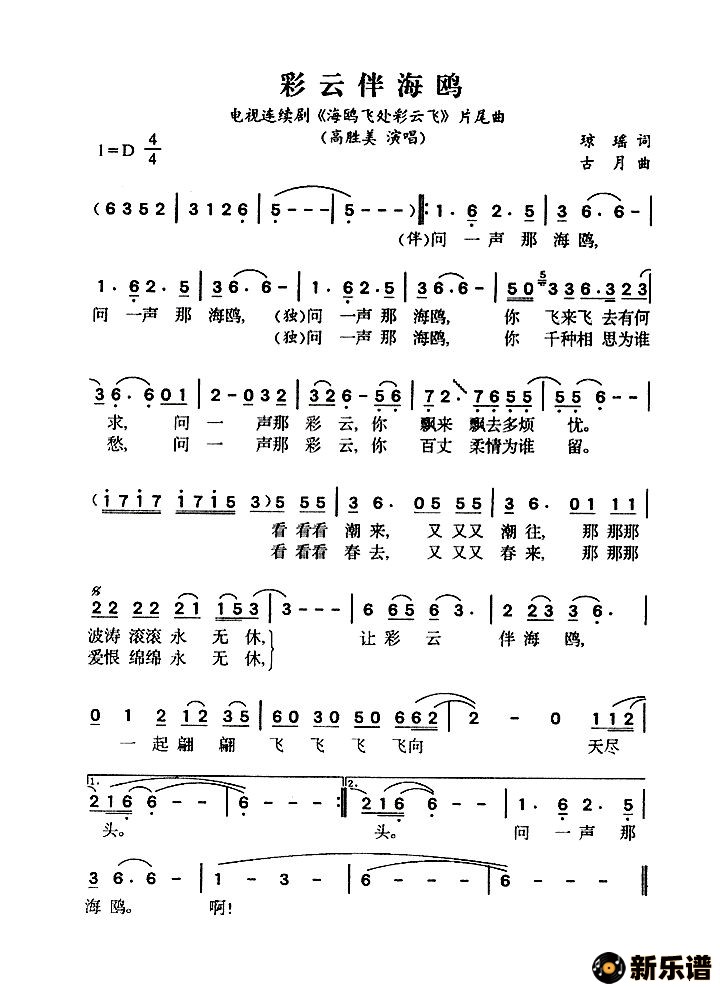 彩云伴海鸥(电视剧《海鸥飞处彩云飞》片尾曲)高胜美 高胜美演唱的彩云伴海鸥(电视剧《海鸥飞处彩云飞》片尾曲)歌词,彩云伴海鸥(电视剧《海鸥飞处彩云飞》片尾曲)最新曲谱. 版本一:转自《金色风铃网》版本二