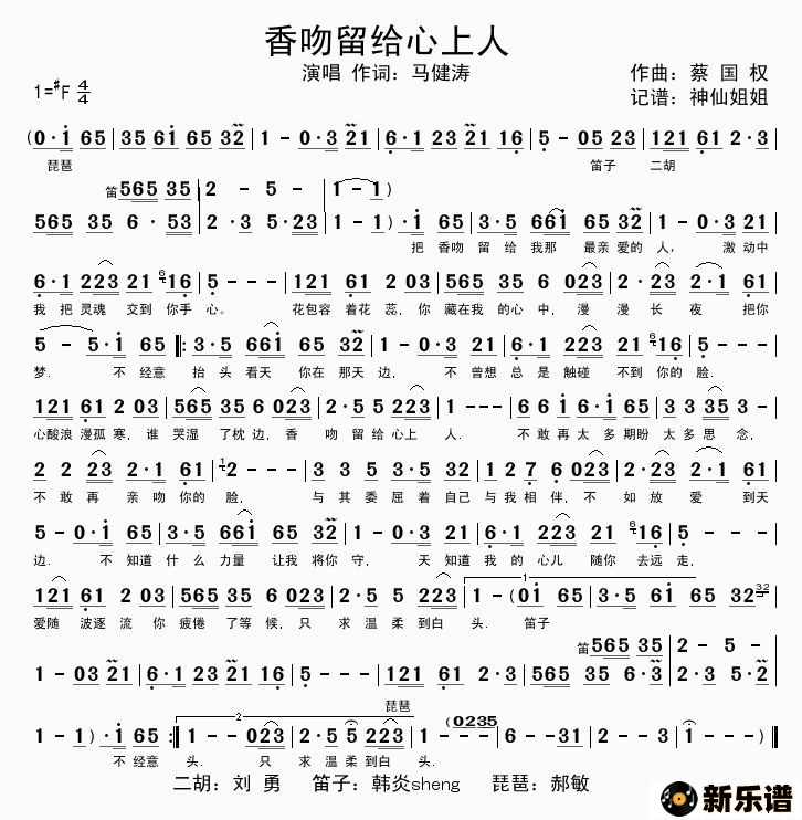 马健涛演唱的香吻留给心上人歌词,香吻留给心上人最新曲谱.