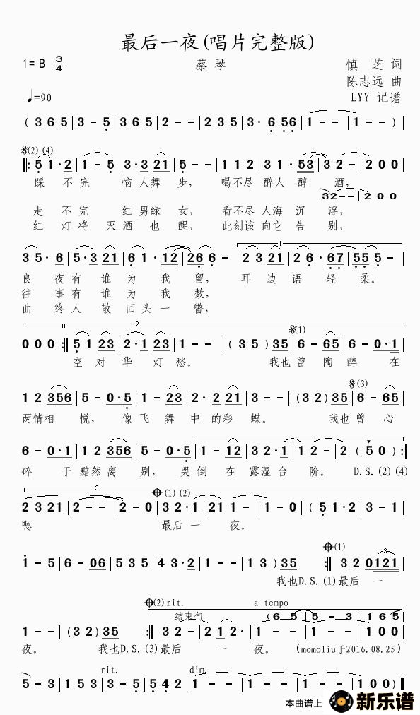 《最后一夜》最新曲谱 蔡琴-momoliu制谱