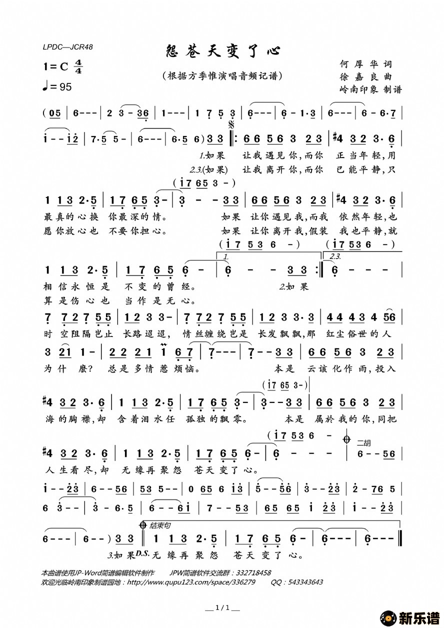 《怨苍天变了心》最新曲谱 方季惟-岭南印象制谱