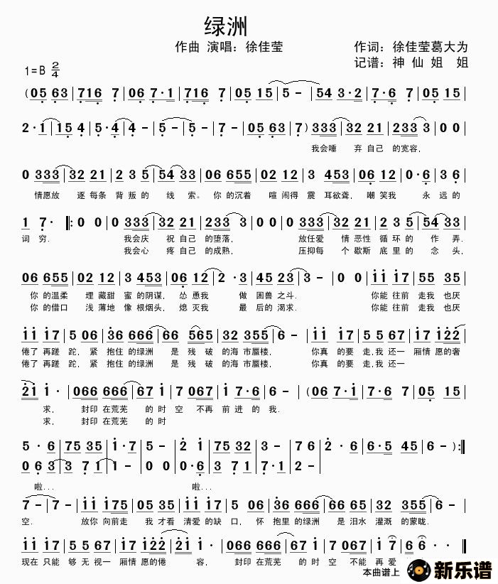 徐佳莹演唱的绿洲歌词,绿洲最新曲谱.
