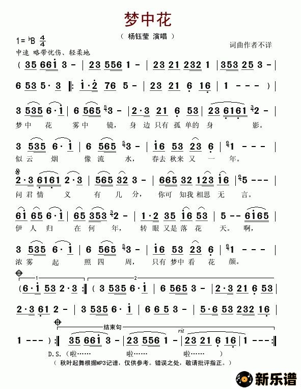 杨钰莹演唱的梦中花歌词,梦中花最新曲谱.