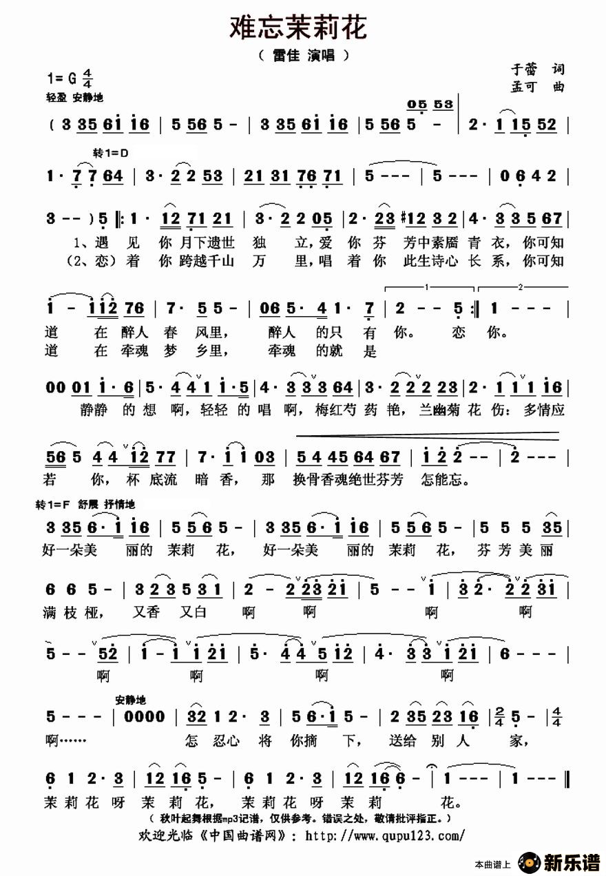 《难忘茉莉花》最新曲谱 雷佳