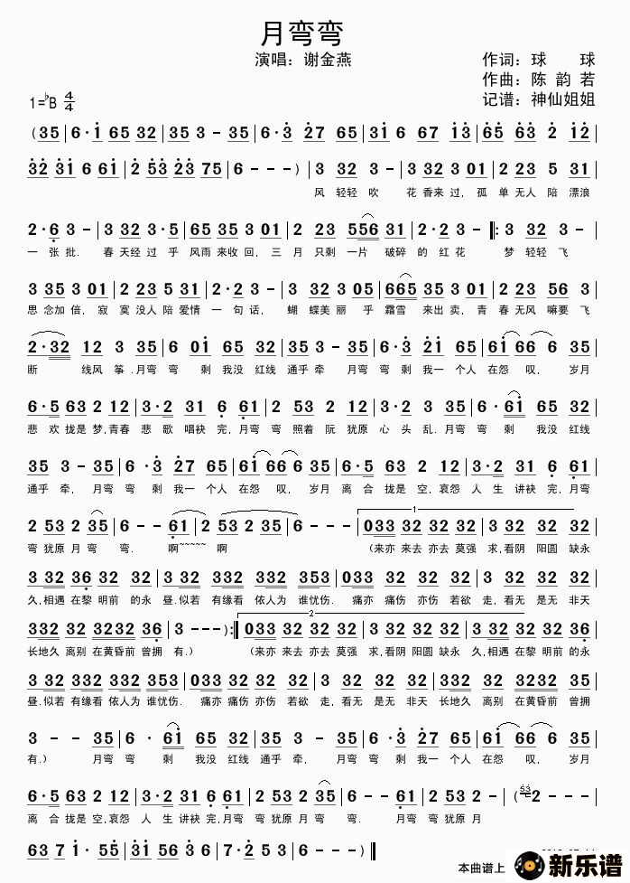 谢金燕演唱的月弯弯 歌词,月弯弯 最新曲谱.