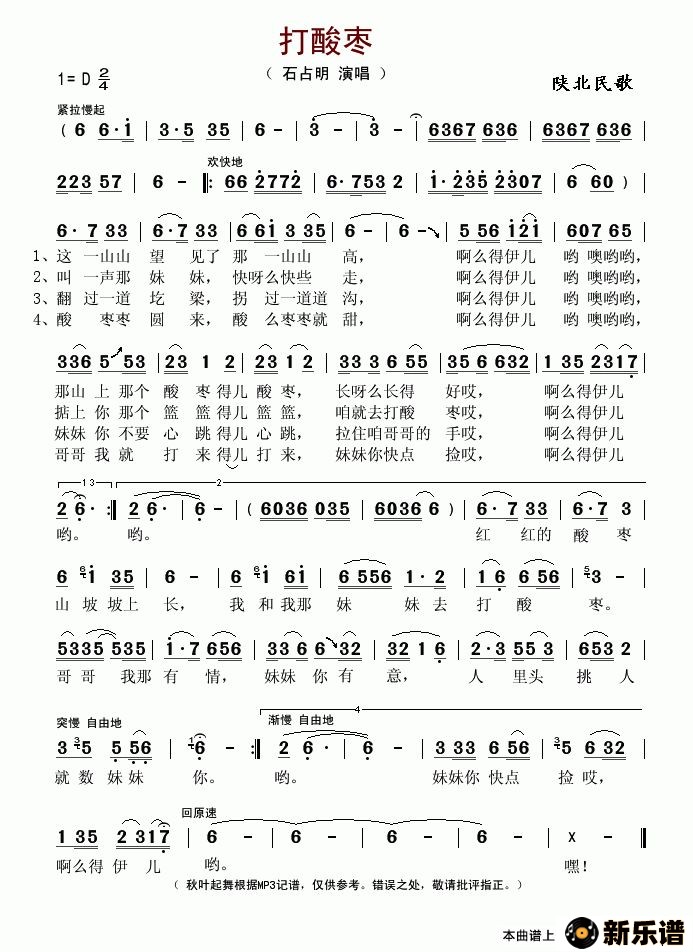 石占明演唱的打酸枣歌词,打酸枣最新曲谱.