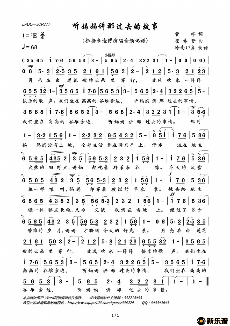 《听妈妈讲那过去的故事》最新曲谱 朱逢博-岭南印象制谱