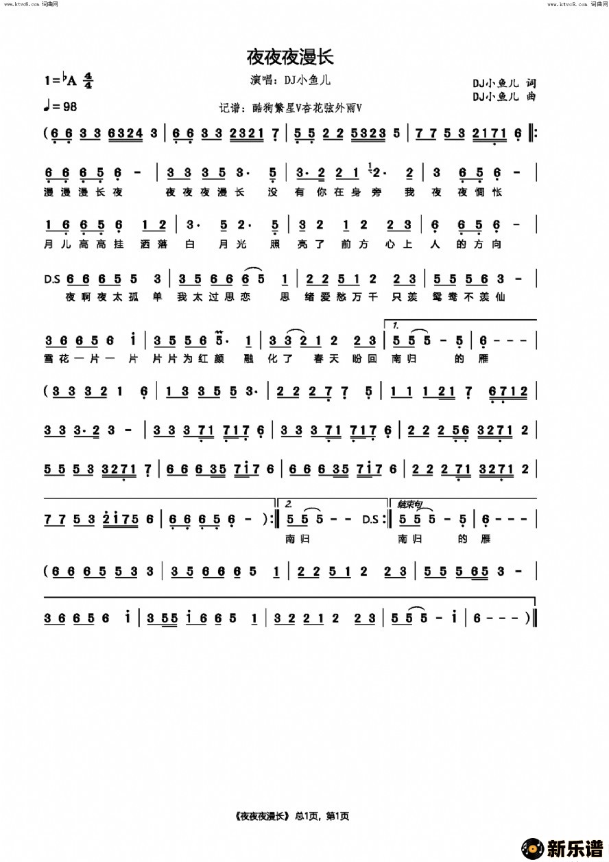 《夜夜夜漫长》最新曲谱 DJ小鱼儿