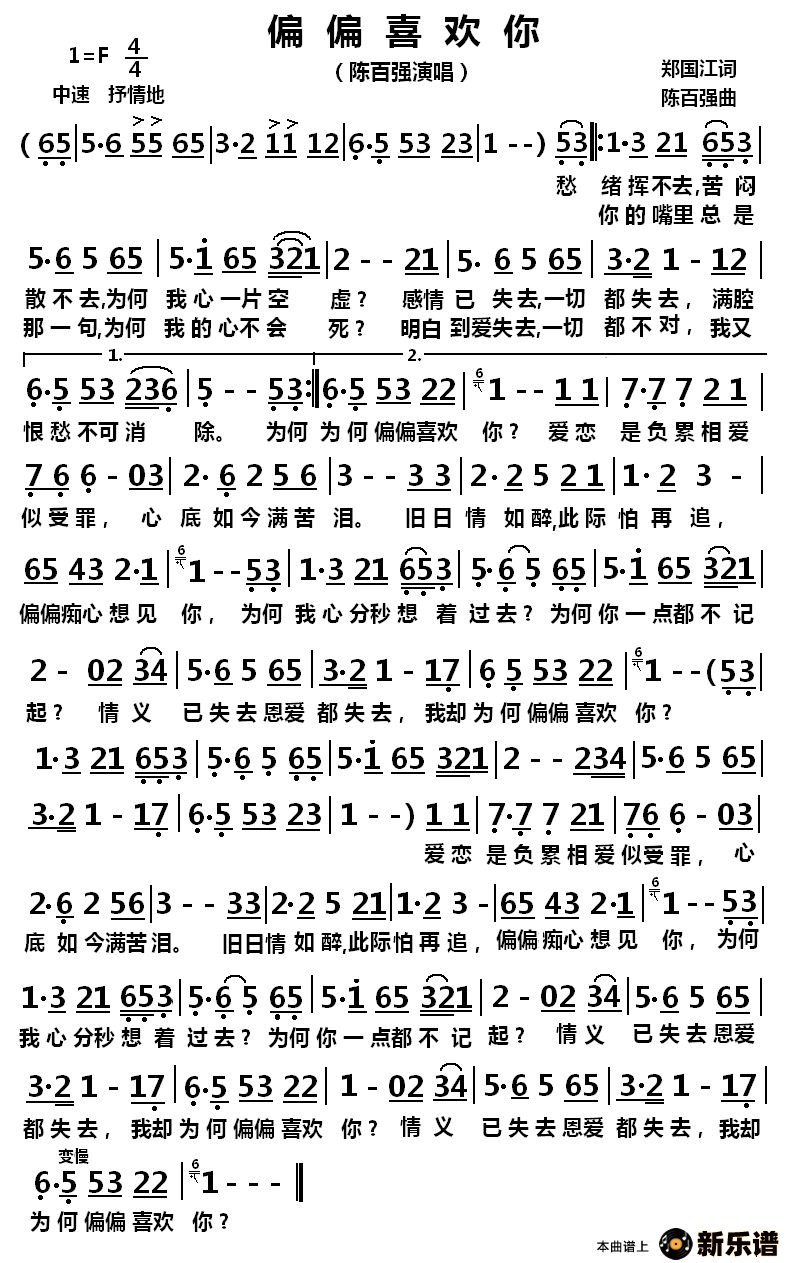 陈百强演唱的偏偏喜欢你歌词,偏偏喜欢你最新曲谱.
