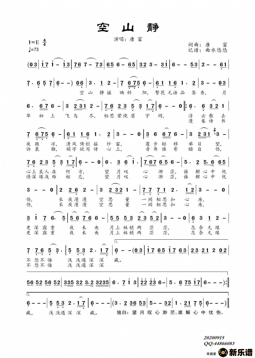 唐富演唱的空山静歌词,空山静最新曲谱.