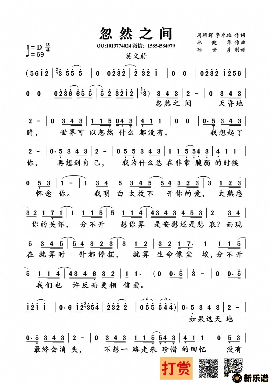 莫文蔚演唱的忽然之间歌词,忽然之间最新曲谱.