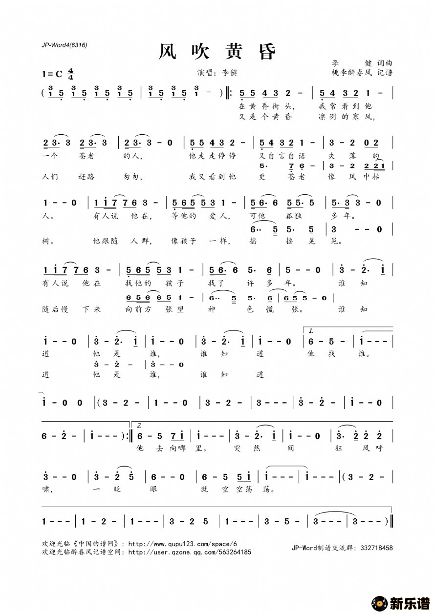 《风吹黄昏》最新曲谱 李健-桃李醉春风制谱
