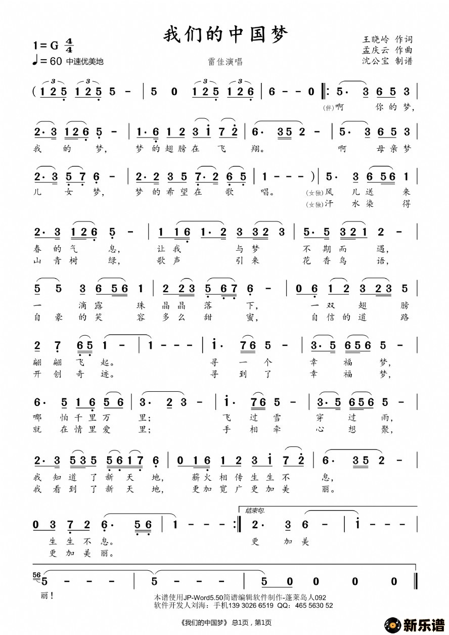 《我们的中国梦》最新曲谱 雷佳-沈公宝制谱