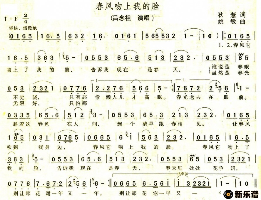 吕念祖演唱的春风吻上我的脸歌词,春风吻上我的脸最新曲谱.