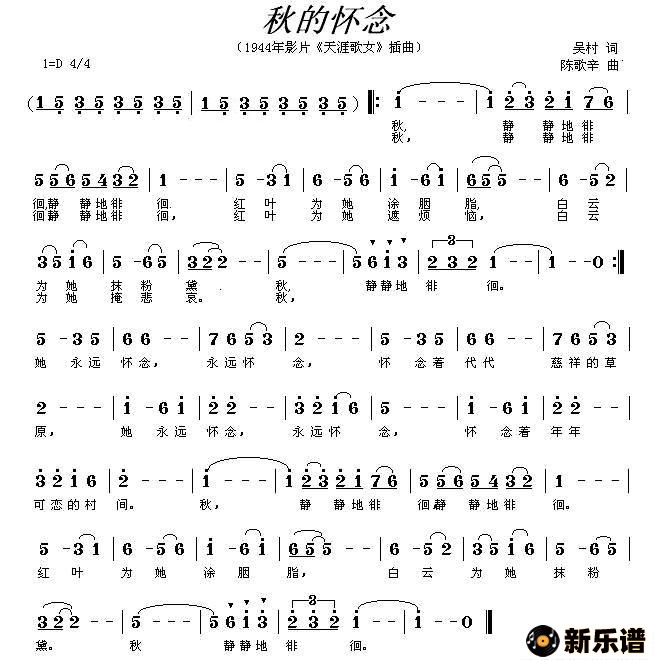 演唱的秋的怀念(电影《天涯海角歌女》插曲)歌词,秋的怀念(电影《天涯海角歌女》插曲)最新曲谱.