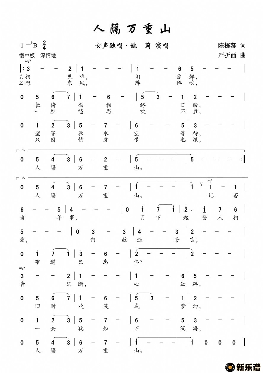 姚莉演唱的人隔万重山歌词,人隔万重山最新曲谱.