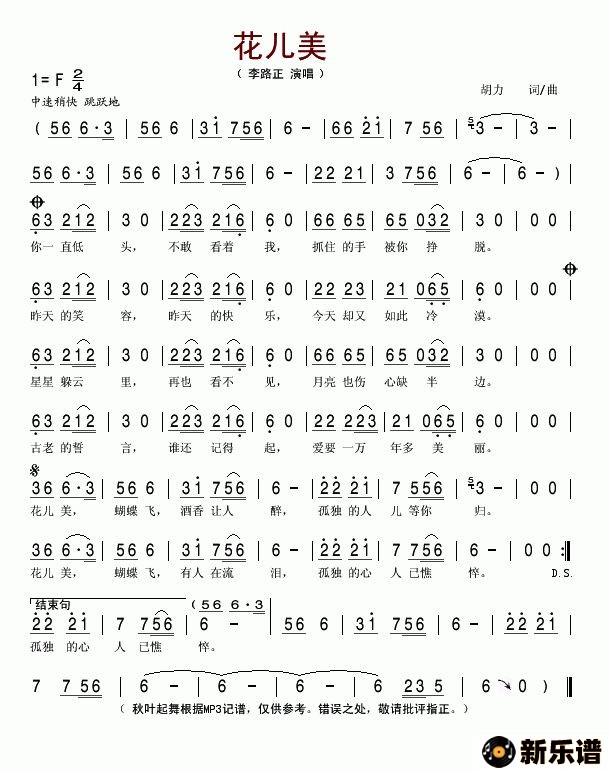 李路正演唱的花儿美歌词,花儿美最新曲谱.