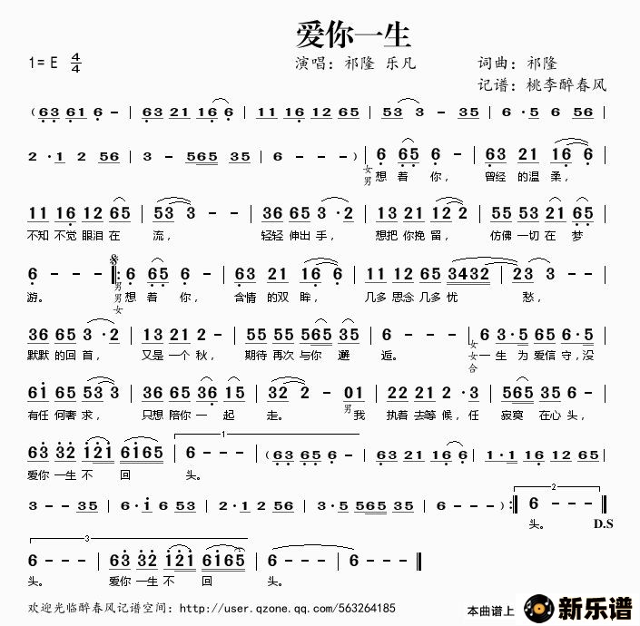 祁隆 乐凡演唱的爱你一生歌词,爱你一生最新曲谱.